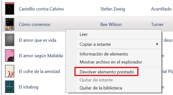 La devolución anticipada no es posible desde el lector de libros electrónicos, pero se puede desde Adobe Digital Editions. En la biblioteca de Adobe Digital Editions, clicando en el botón derecho, deberá seleccionar la opción Devolver elemento prestado.